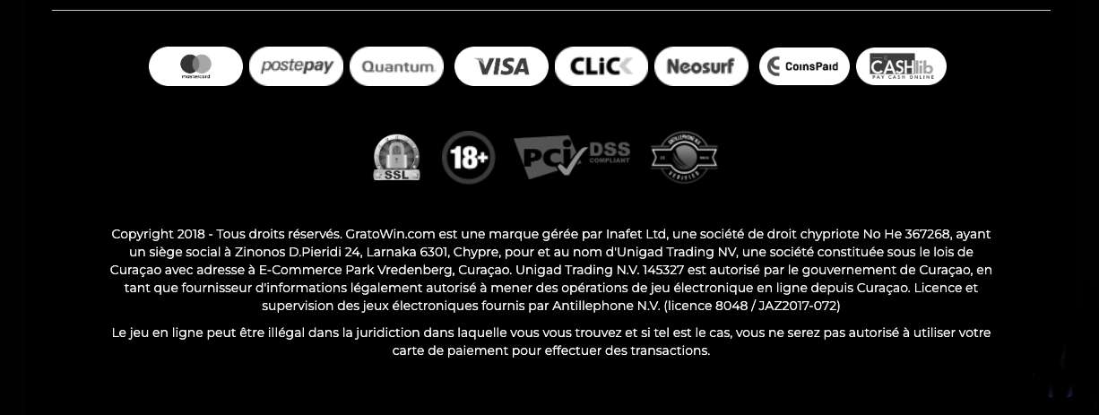 Le code bonus Gratowin Casino à utiliser sur chacun de ces dépôts est respectivement SALUT1, SALUT2 et SALUT3. Le montant minimum de chaque dépôt est de 20€ et la condition de mise est de 35 fois le montant du bonus.